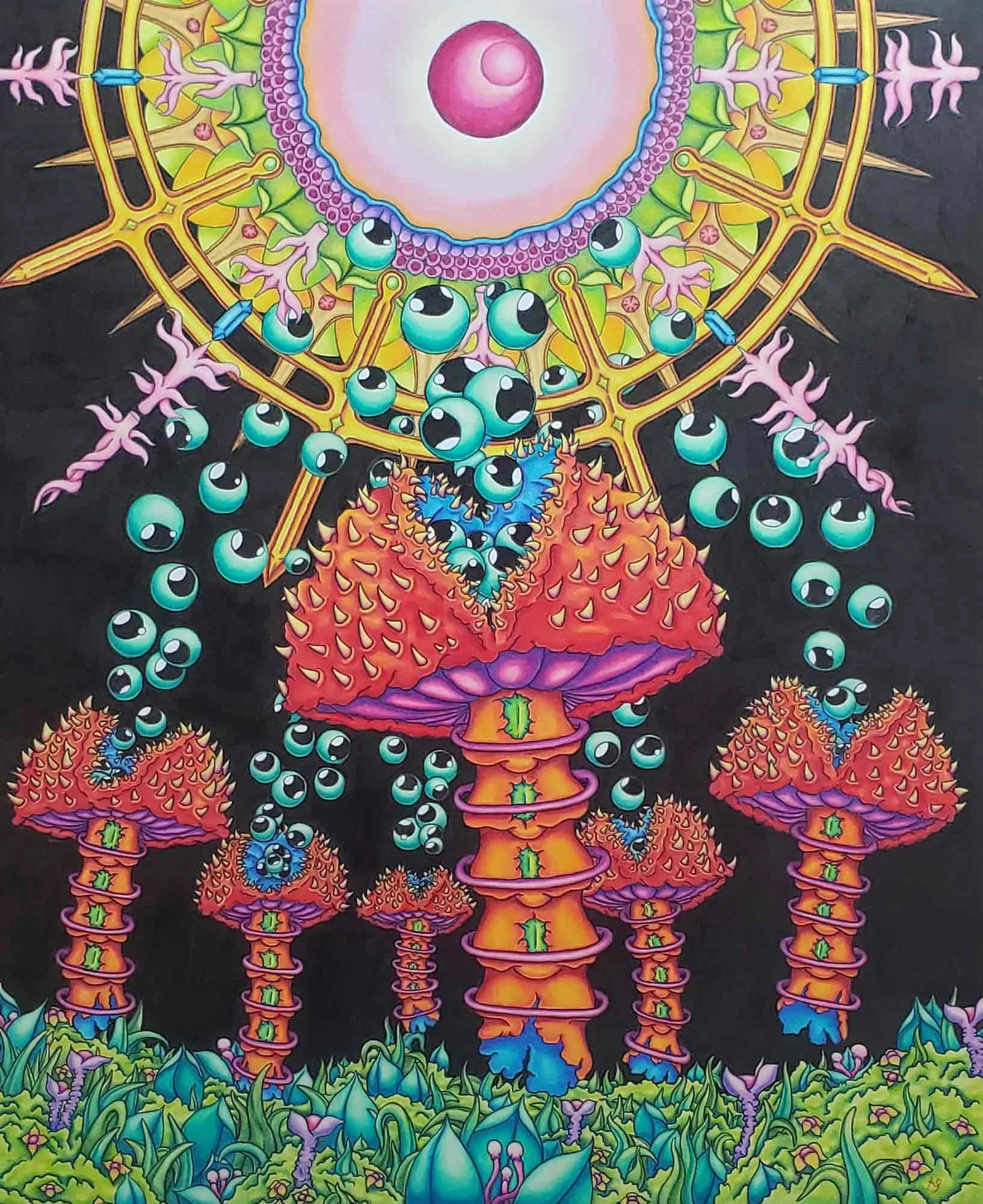 We love the atmosphere Alex Sylvester (he/him) creates and the feelings evoked from his strong, acidic colors juxtaposed against dark backgrounds. Alex shared this recently-completed piece with his fellow Collective members, and we asked to feature it for Earth Day.